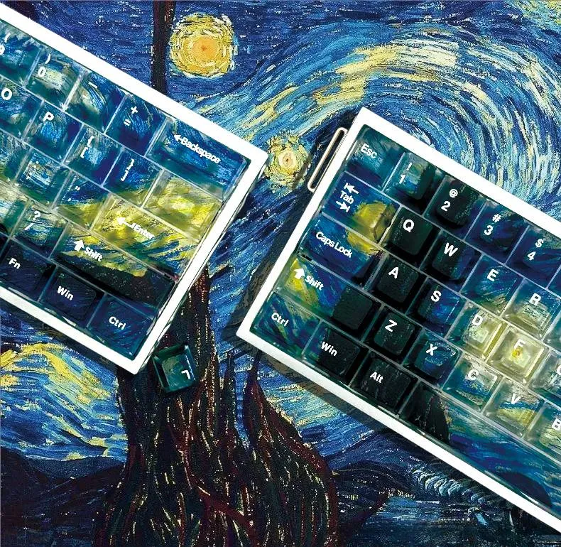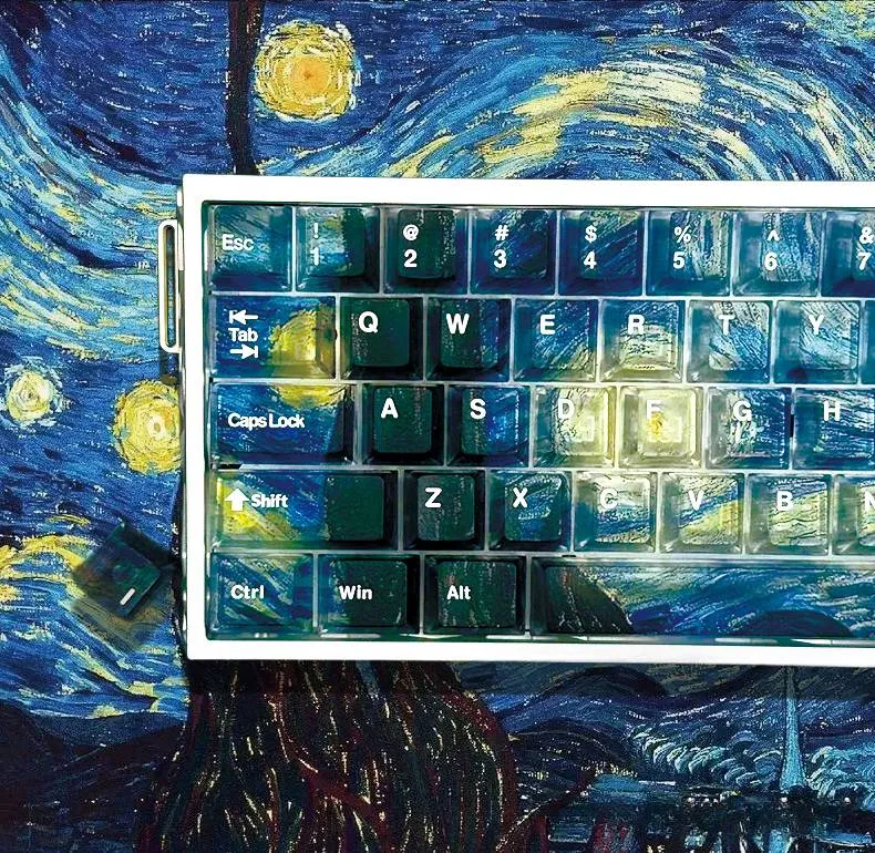 Make your keyboard a work of art with the Starry Night Themed Cherry Keycap Set! To meet your demands select a keycap set compatible with 60/68 layouts or the Starry Night keycap set. These keycaps which are inspired by the famous painting. That capture the spirit of Van Gogh’s work with their exquisite combination of blue, black and yellow. Visibility and style are guaranteed by the stark contrast created by the white lettering. With its comfortable Cherry profile and PC design. That this keycap set celebrates vintage art while improving your typing experience. It’s a fun addition to any setup that ideal for gamers and art enthusiasts alike!