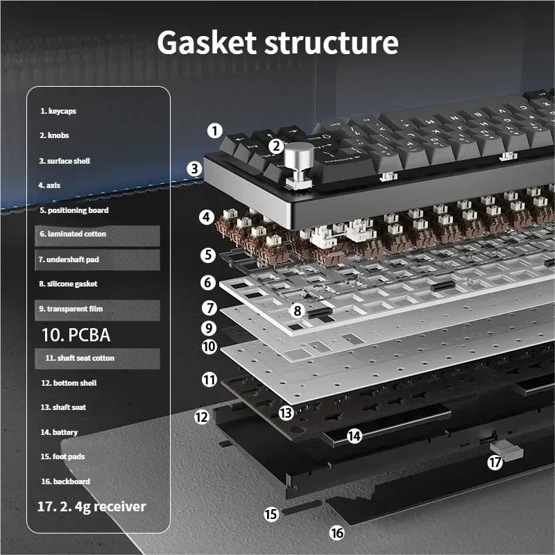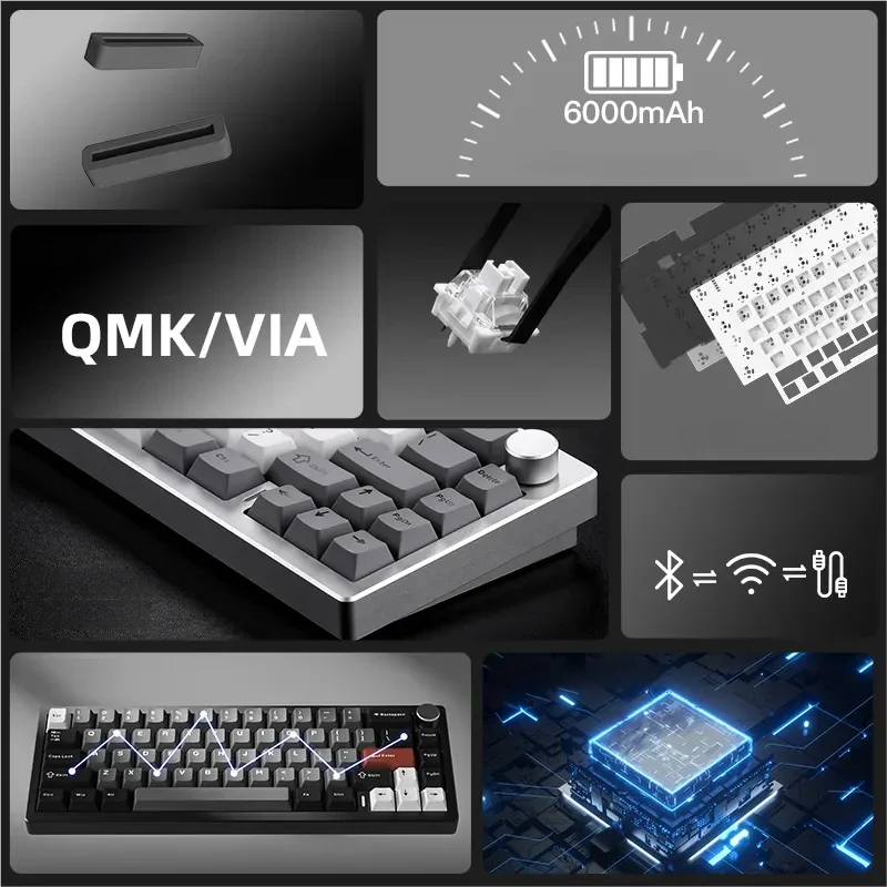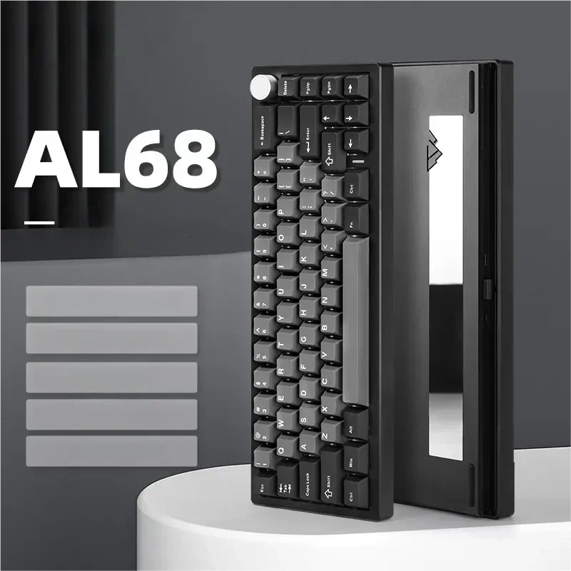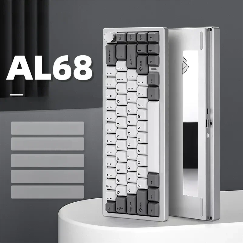 Unleash an unparalleled typing experience with the Stylish AL68 Cherry Tri-Mode Mechanical Keyboard, where advanced engineering meets sleek, modern design. This premium custom keyboard features an innovative gasket mount keyboard structure, meticulously engineered to absorb impact and deliver a satisfyingly soft, resonant keystroke with every press. Crafted from robust aluminum, the AL68 boasts a sleek metallic minimalism, especially with its reflective Star Silver mirror backplate, creating a visual masterpiece that complements any high-end setup. The vibrant RGB lighting adds a dynamic flair, fully customizable to match your mood or setup. Equipped with exquisite Snow Top Coffee V2 switches, this custom aluminum keyboard ensures a tactile and responsive feel that elevates your performance. Designed for enthusiasts and professionals alike, the AL68 is more than just a keyboard. That its a personalized excellence, a premium custom keyboard built to inspire excitement and transform your daily interactions.