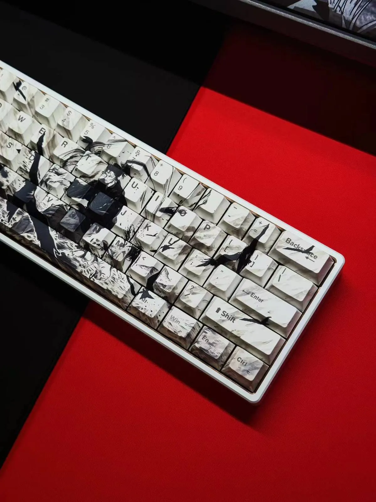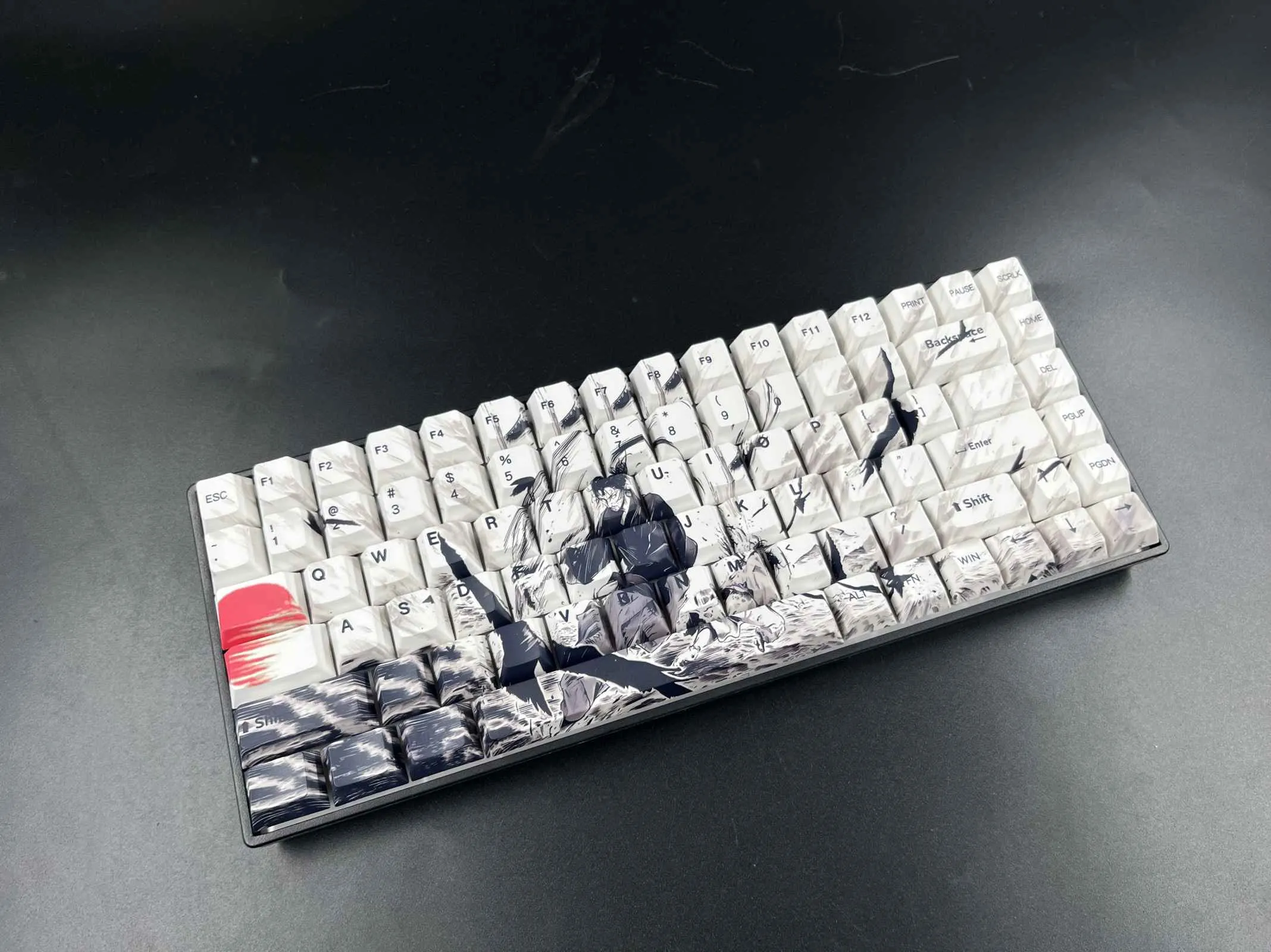 Revitalize your keyboard with the captivating Sunset With Gull Cherry Keycap Set! This set has a clean white base and eye-catching black keycaps with bold black lettering. Every keystroke is a pleasure because to the intriguing character on middle of the layout. Which provides a distinctive touch. Some keycaps evoke peaceful sunset moments with their beautiful emblems of birds and a glowing sun. These keycaps are long-lasting and is ideal for people who value originality. Which beauty in their work environment. Use this gorgeous collection to enhance your typing experience!