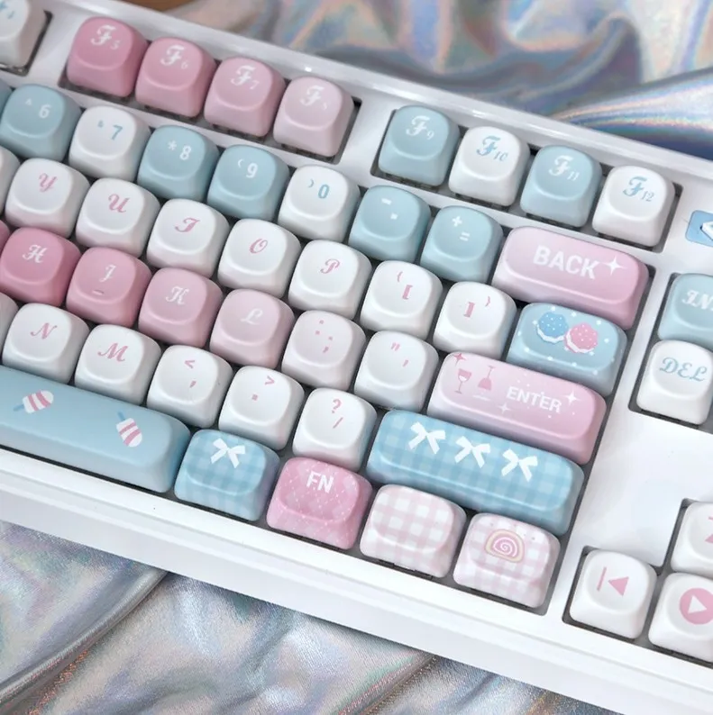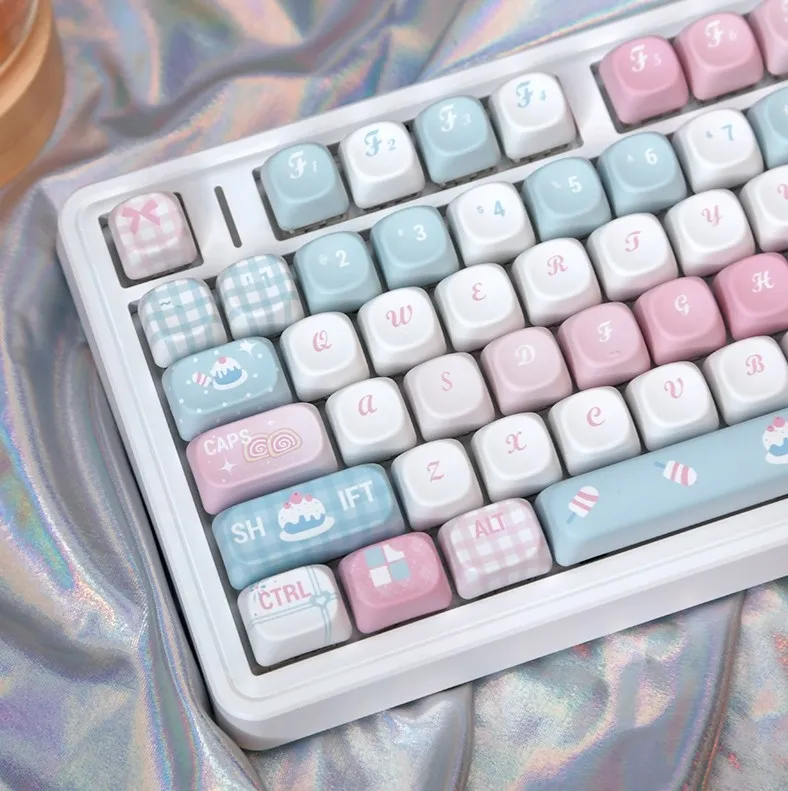 Savor the Sweet Themed LS01 Tri-Mode Mechanical Keyboard’s charming design! The attractive combination of white, pink and blue keycaps on this adorable keyboard creates a visually pleasing look. To customize your typing experience that you can select from eight different switch. Which including options such as Red, Blue and Peach. Its whimsical atmosphere is enhanced by the unique touch of the gridline art design. Every keystroke is a treat thanks to the sweet dessert symbols that grace the Space Key and Shift Key. Every typing session will be stylish and long-lasting thanks to this keyboard’s sturdy PBT construction. Which is distinctive white, blue and pink letters in a unique font design.