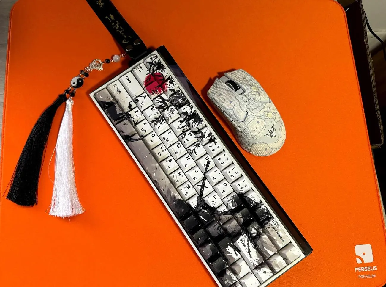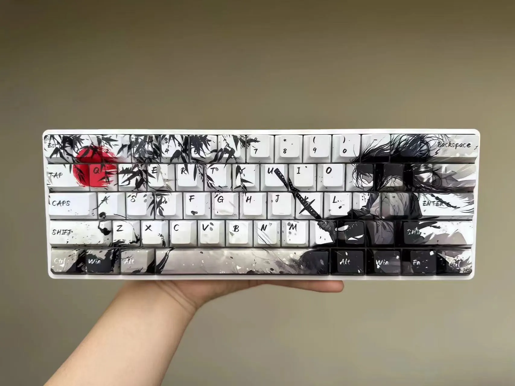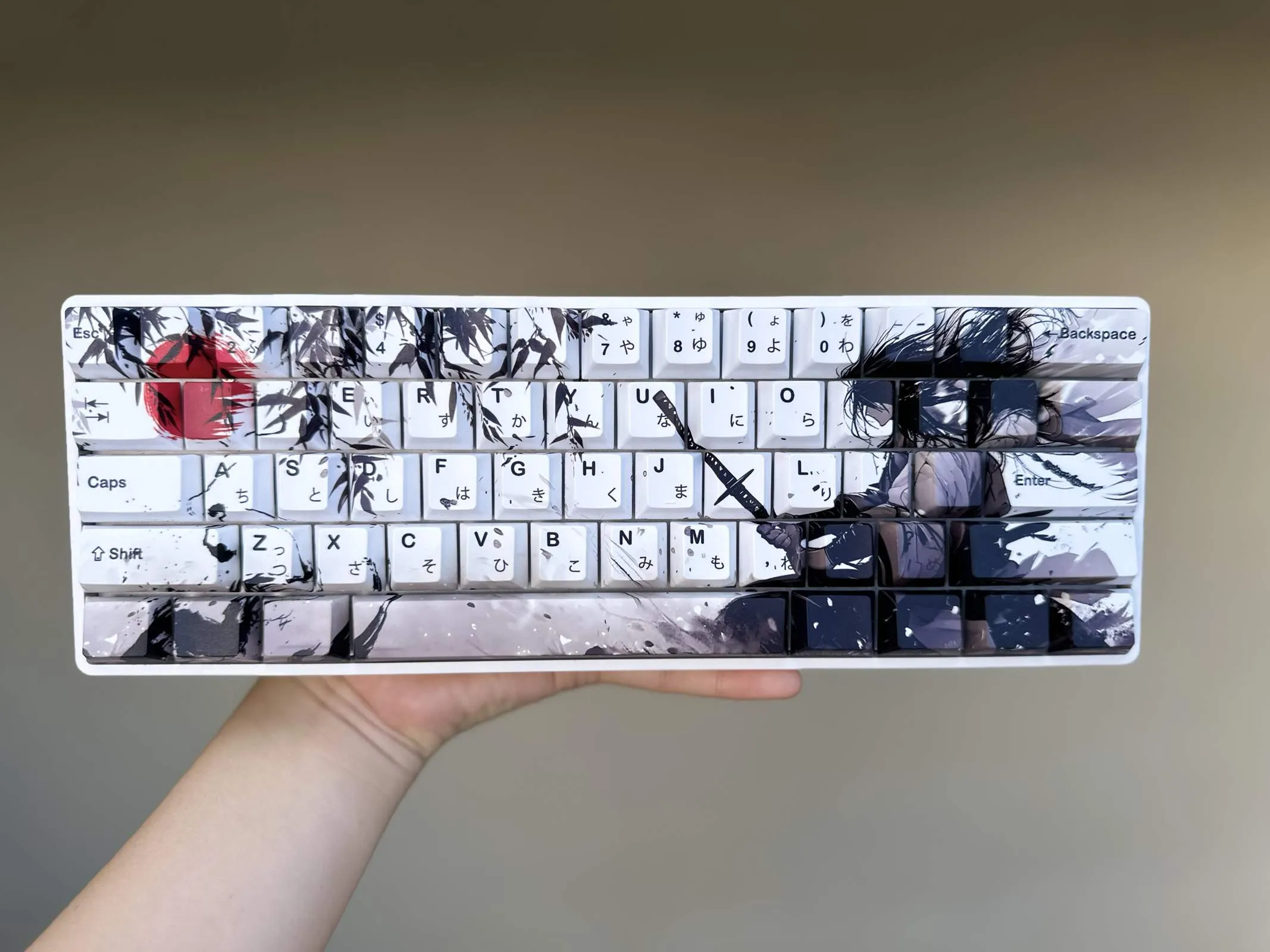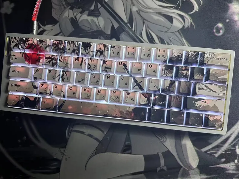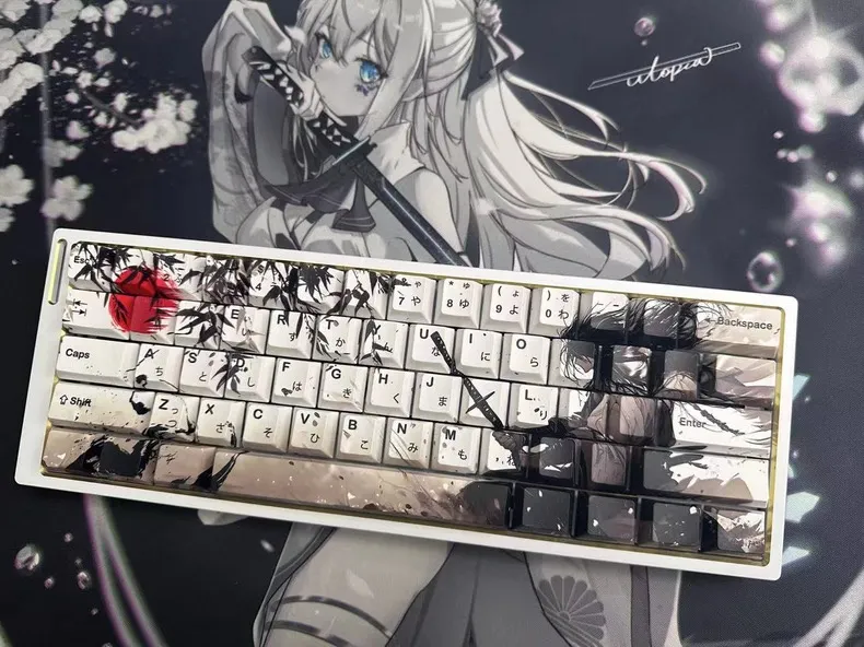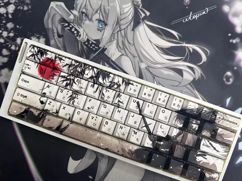 Take your keyboard to the next level with the gorgeous Sword Warrior Cherry Keycap Set! Select one of two options: the one without Japanese root words and the one with them for authenticity. Rich brown keycaps and bold black text contrast with the white base of each keycap. Intricate leaves around a powerful warrior figure brandishing a sword in the right-hand arrangement. Elegant motifs of ink wash painting accentuate the design that fusing modernism and tradition. These keycaps are long-lasting and comfortable because they are made of sturdy PBT material. This combination which features a traditional Cherry profile. That is ideal for both keyboard aficionados and martial arts enthusiasts!
