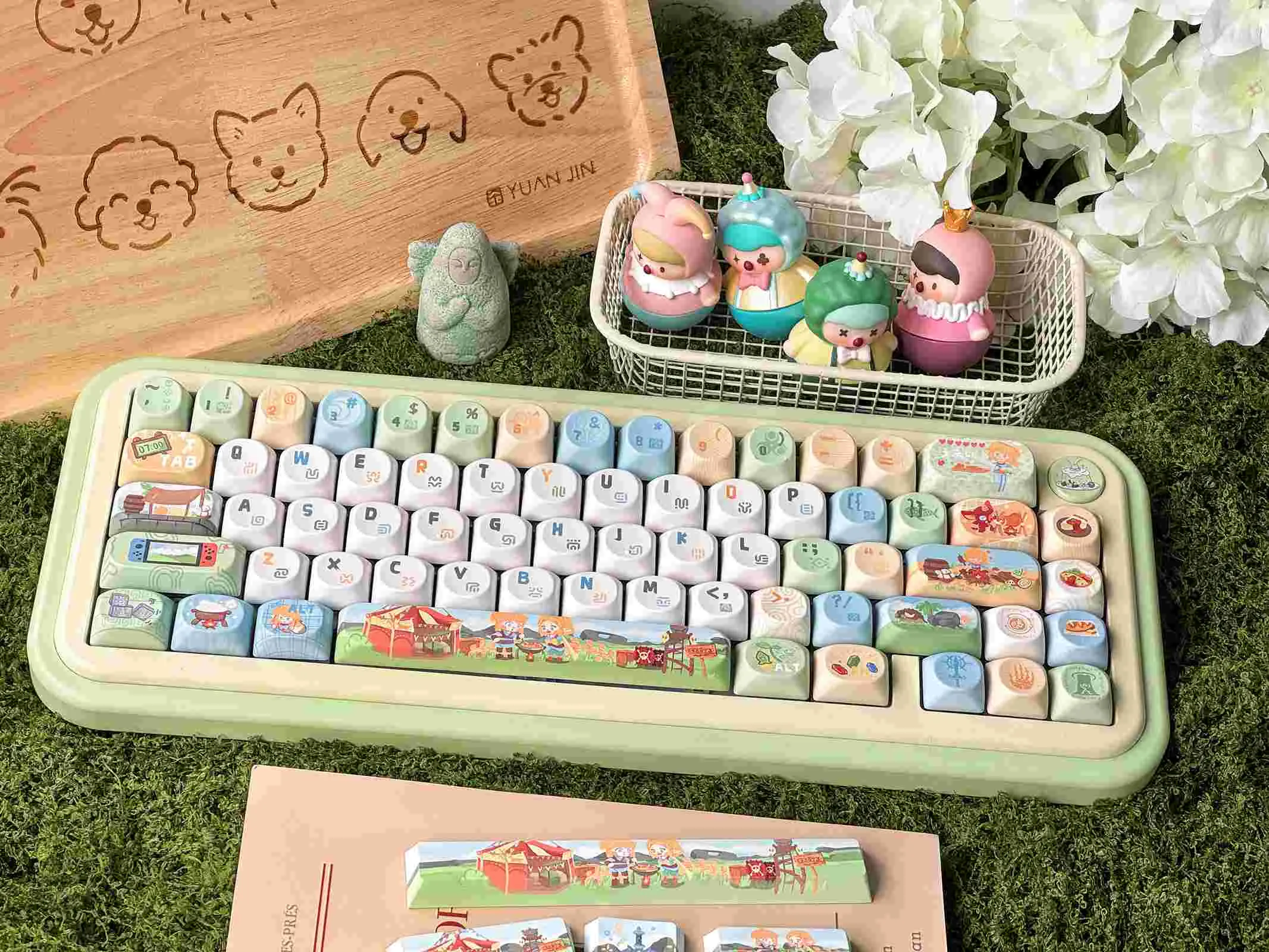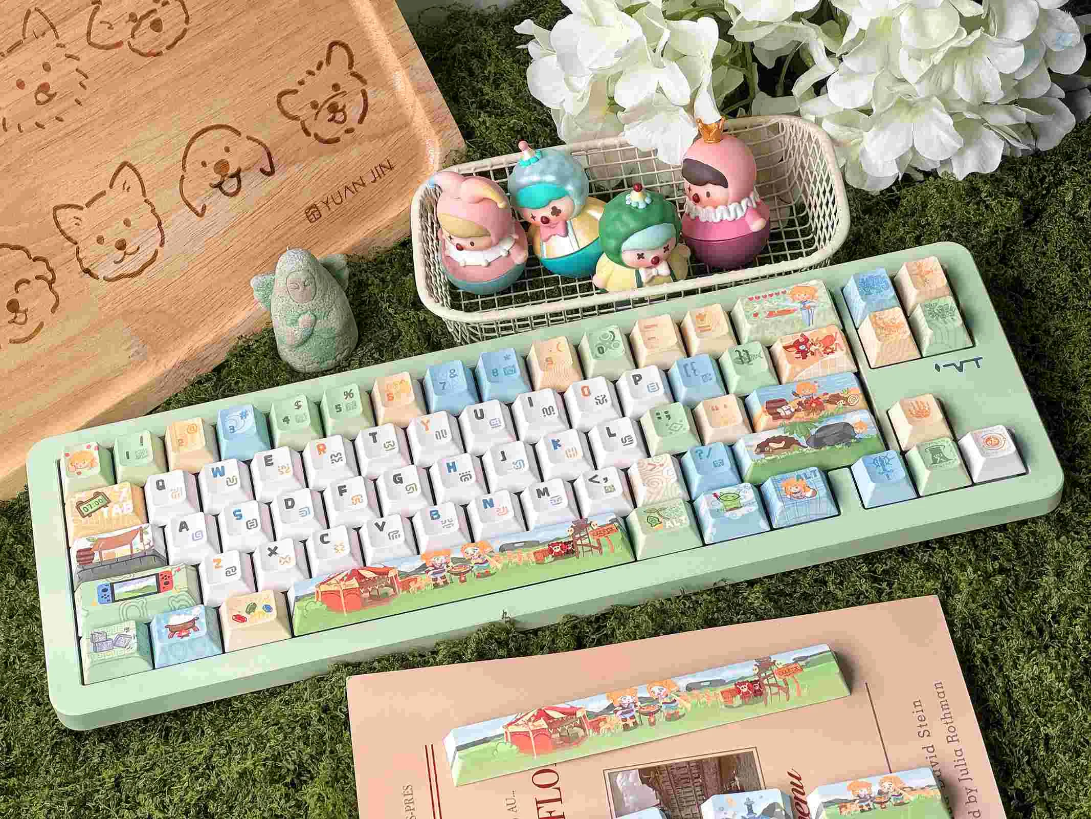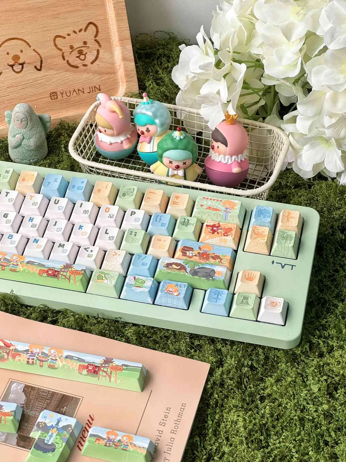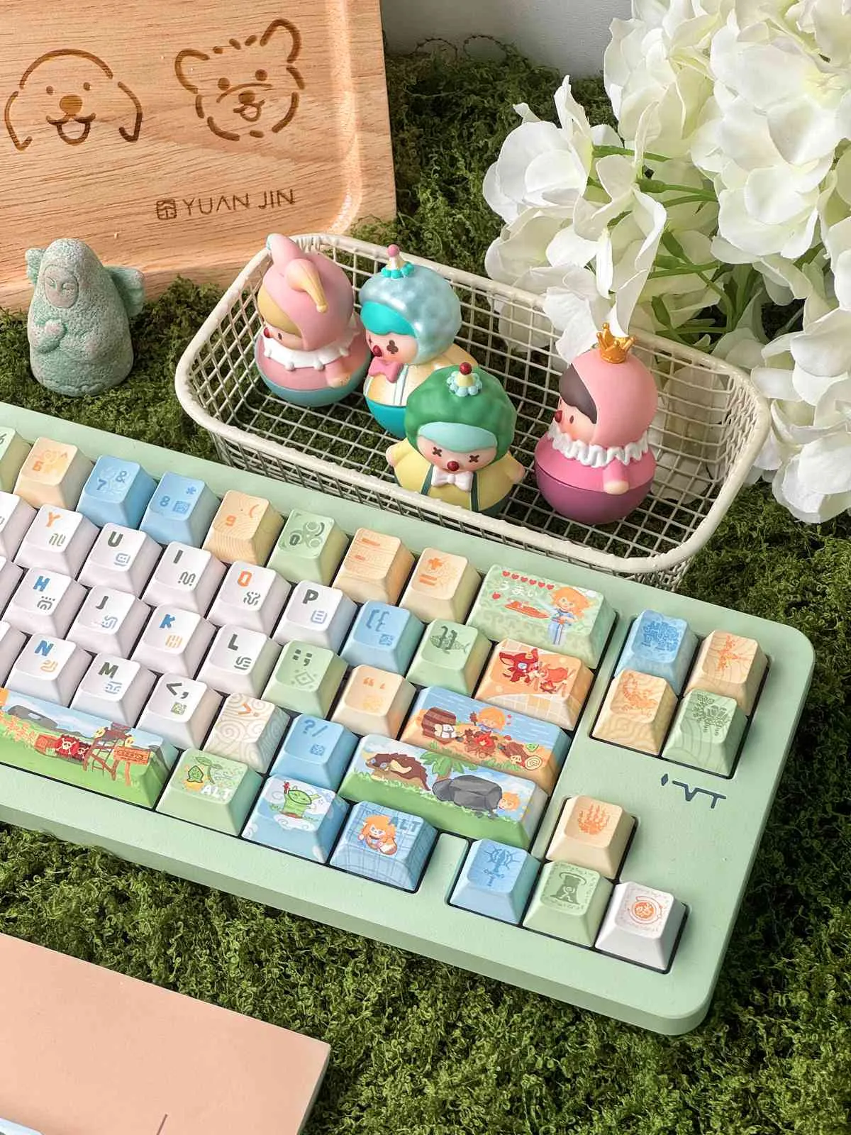 Get the Characters Keycap Set from The Legend of Zelda to revolutionize your typing experience! Both the OEM Keycap Set and the SO Keycap Set are made to please fans. The vivid green, blue and pale orange keycaps look stunning against the stark white base. Your keyboard will stick out thanks to its distinctive dark blue and blue lettering which adds a fashionable touch. Charming character icons on certain keycaps add to the retro vibe. For any Zelda fan which the Space Key’s comical tent emblem design is ideal. Made from sturdy PBT material that this keycap set is a must-have for collectors and fans alike. Since it blends quality with a fun design!