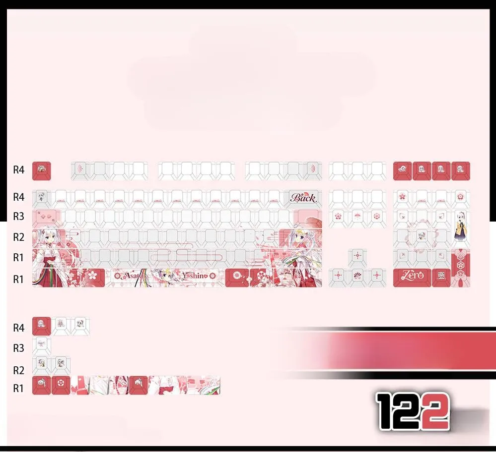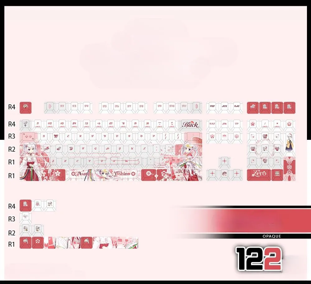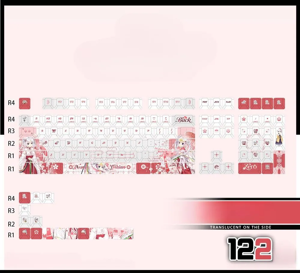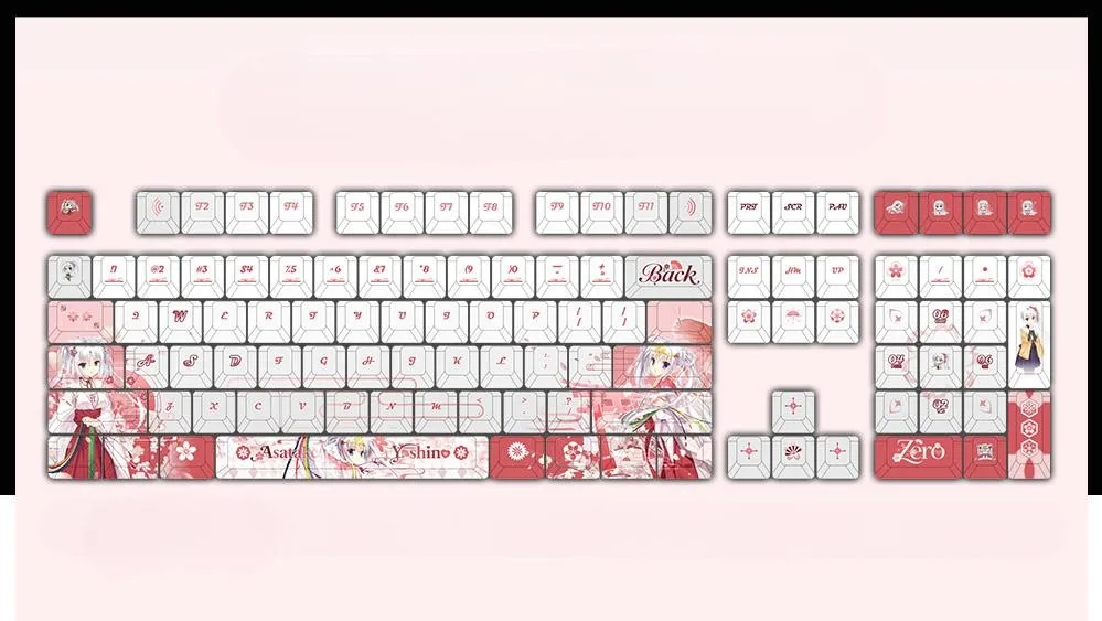 Enhance your typing skills with the captivating Senren * Banka: Tomotake Yoshino Cherry Keycap Set & Mechanical Keyboard! Keyboards with 87 or 108 keys and a Keycap Set with 122 keys are among the five possibilities available. Which is for each of the three keycap styles in this collection: Front-Lit, Side-Lit and Opaque. Charming pink lettering in a distinctive font style is displayed on the gorgeous white base. Which goes well with the vivid red and pink keycaps. While some keycaps have beautiful flower designs. That others have charming character icons such as the ESC Key. This set is perfect for fans and collectors looking for a little whimsy. Because it is made from sturdy PBT in a traditional Cherry profile!