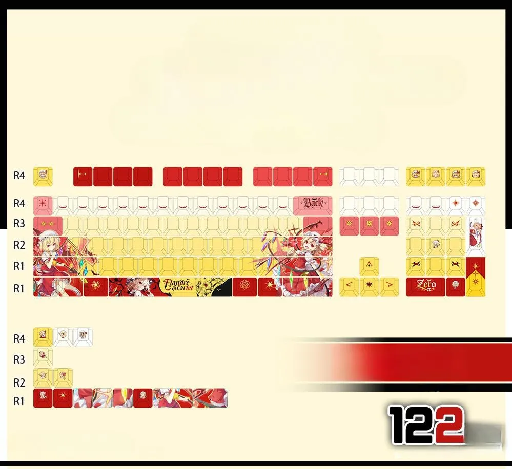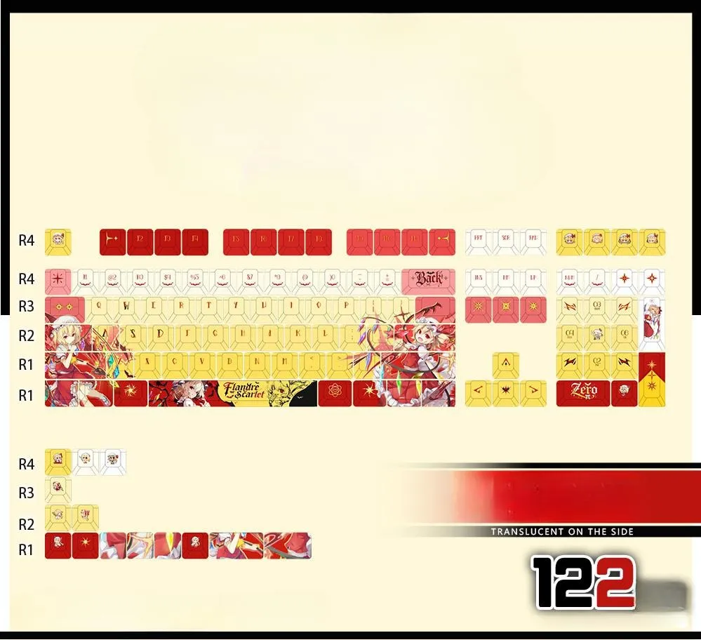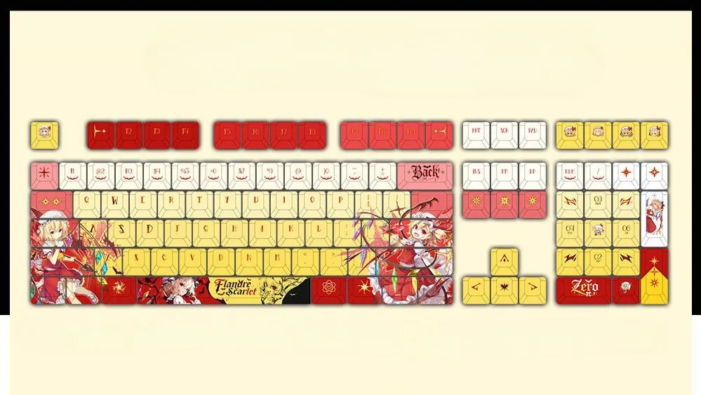 Improve your typing experience with the gorgeous Touhou Project: Mechanical Keyboard with Flandre Scarlet OEM Keycap Set. Front-Lit, Side-Lit and Opaque are three intriguing variations with five different combinations each. Keyboards with 87 or 108 keys, a Keycap Set with 122 keys and Tri-Mode keyboards for increased adaptability are among the available options. Red, white and pink keycaps with striking red and yellow lettering look well with the vivid yellow base. On some keycaps, you can see adorable character icons and on the Space Key, you can see “Flandre Scarlet.” This OEM set is a must-have for any Touhou lover since it blends style and usefulness and is made of sturdy PBT material.
