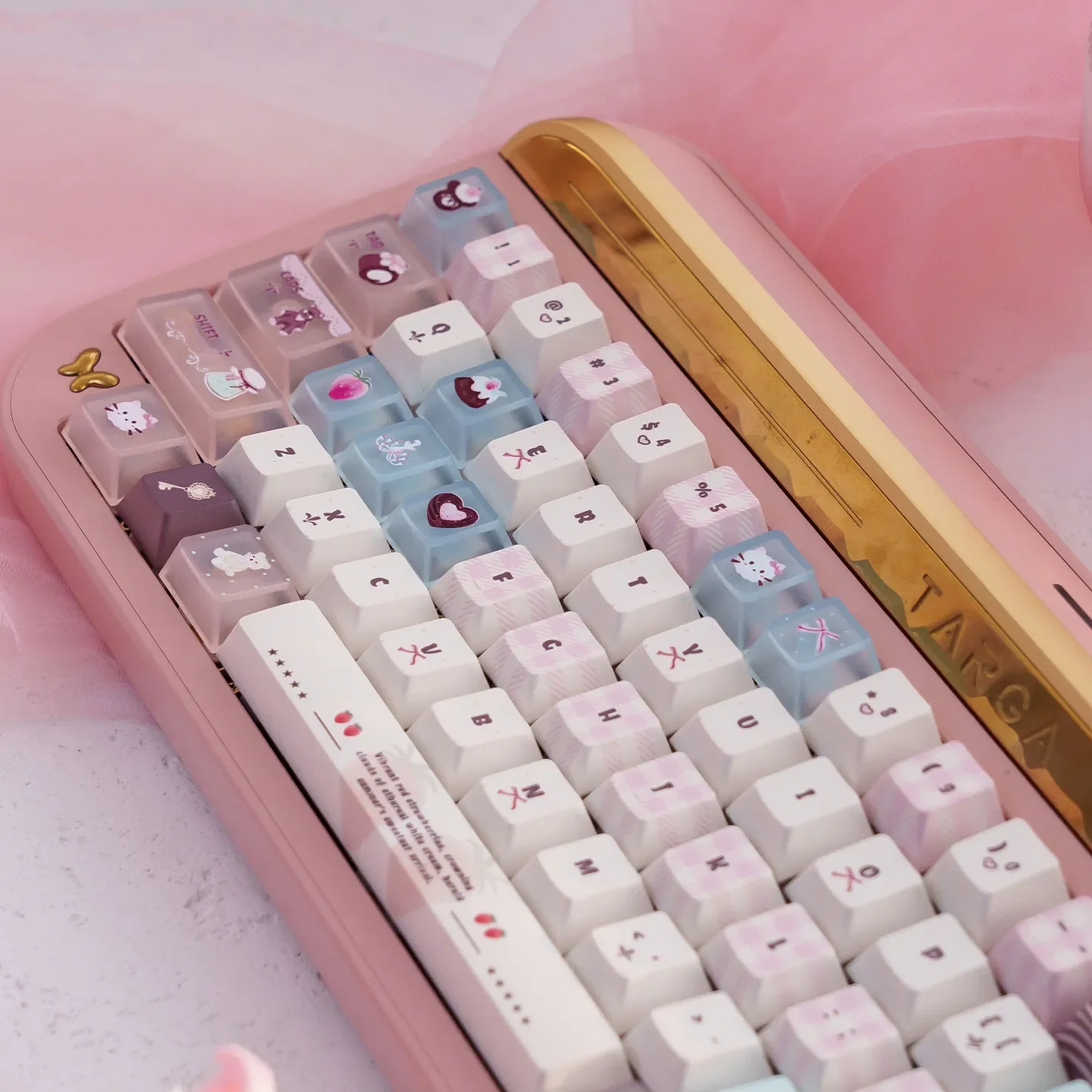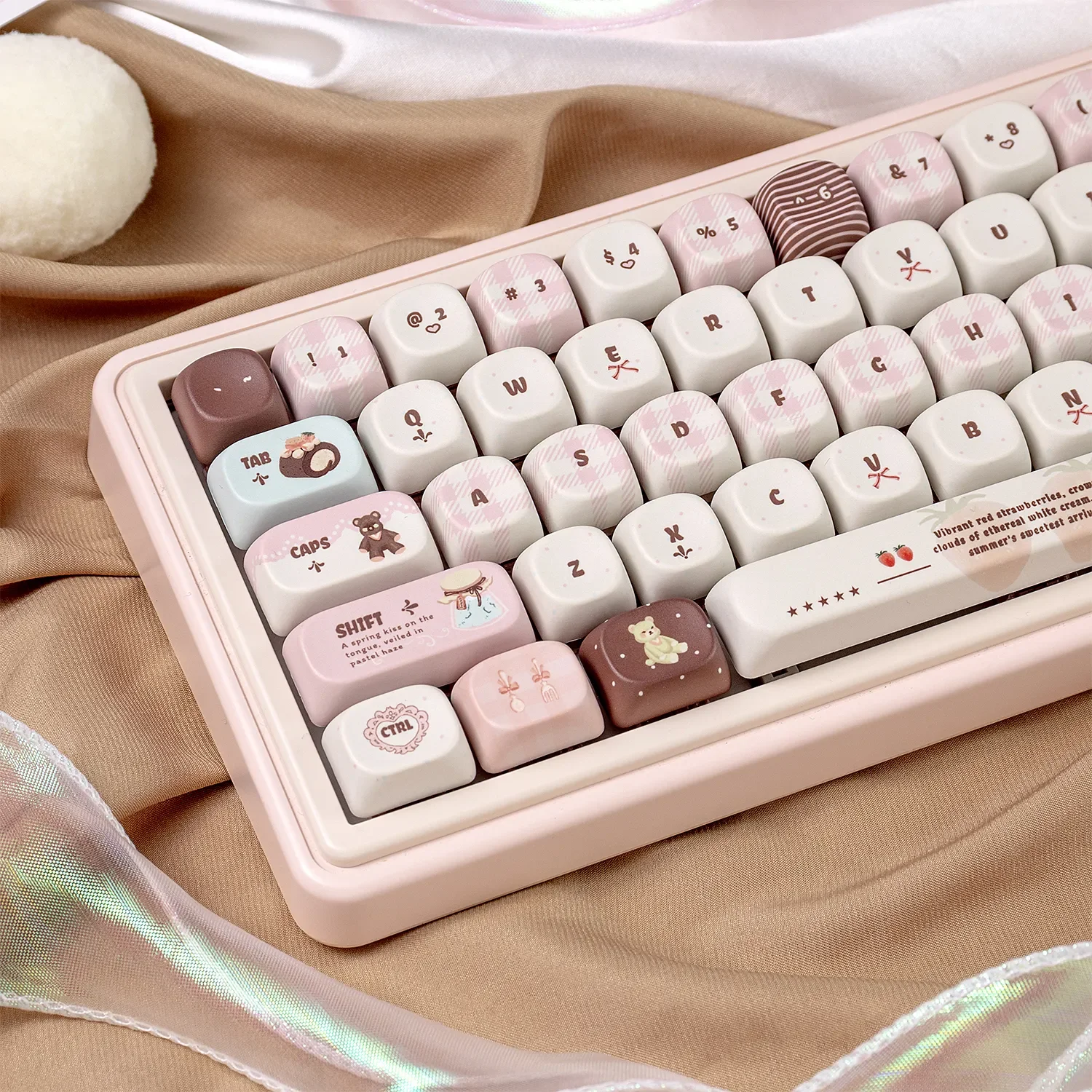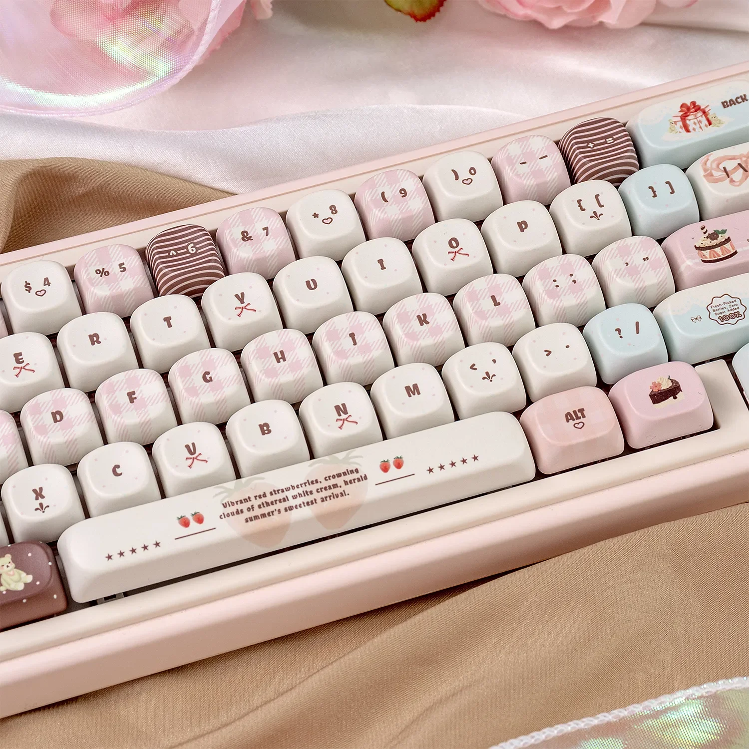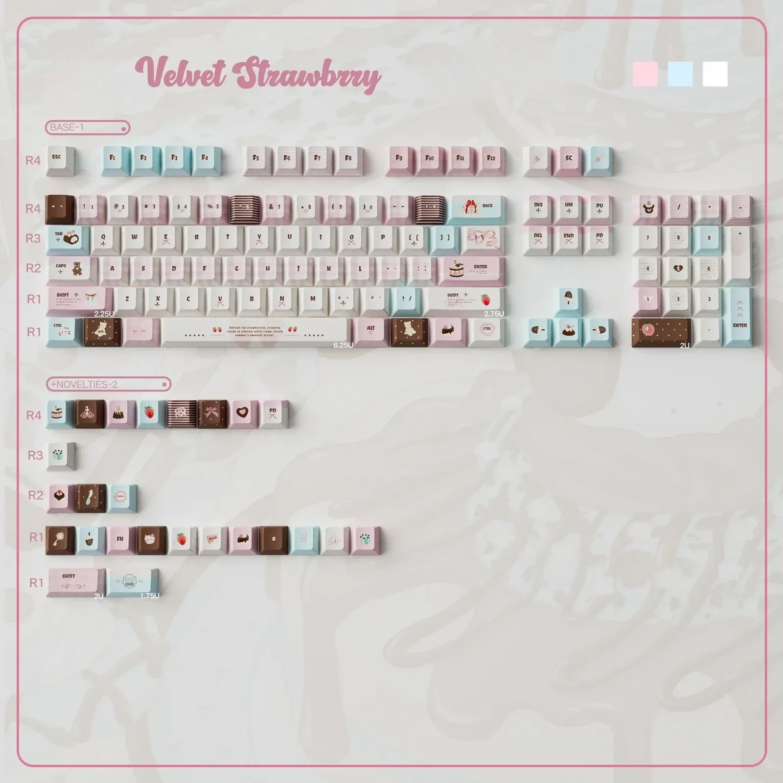 Step into a world of cozy nostalgia with our captivating Velvet Strawberry Series Keycap Set. This artistic keycap set blends whimsical design with premium aesthetics, inviting a touch of delight to your creative workspace. Each of these custom PBT keycaps is meticulously crafted from a PBT+PC blend, offering a unique frosted translucent finish that glows with an ethereal charm. The tactile satisfaction of these custom PBT keycaps is matched only by their visual appeal, as the frosted translucent effect creates a soft, inviting glow. The durable dye-sub keycaps promise a lasting aesthetic, keeping the whimsical strawberry designs vibrant through countless typing sessions. Elevate your keyboard with these charming frosted keyboard caps, meticulously designed to fit seamlessly on most mechanical keyboards, including compatibility for MOA Profile Keycaps and Cherry height. Turn every keystroke into an experience of pure delight with this truly unique keycap set.