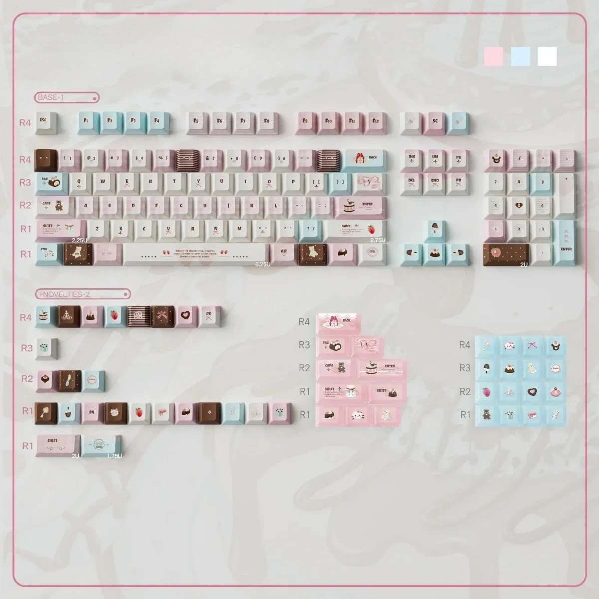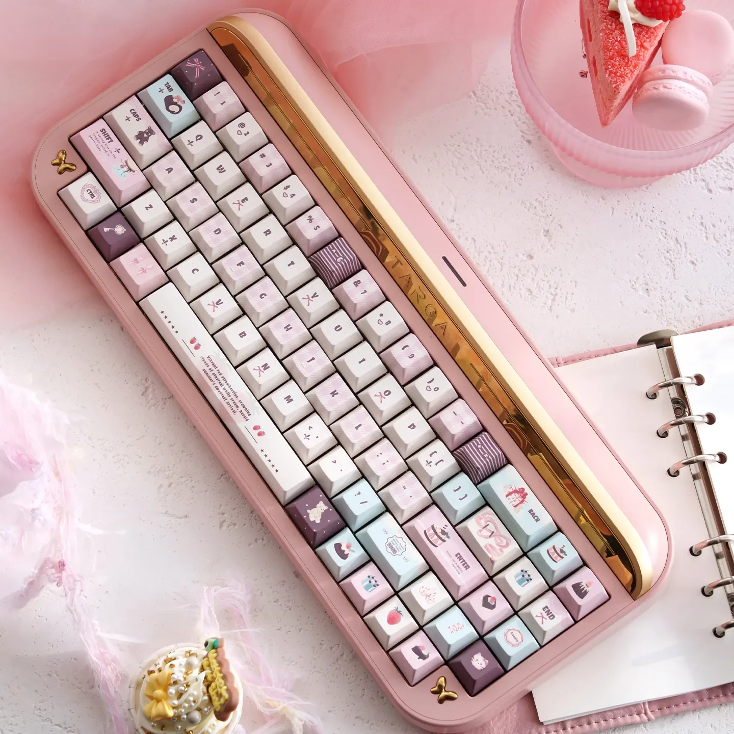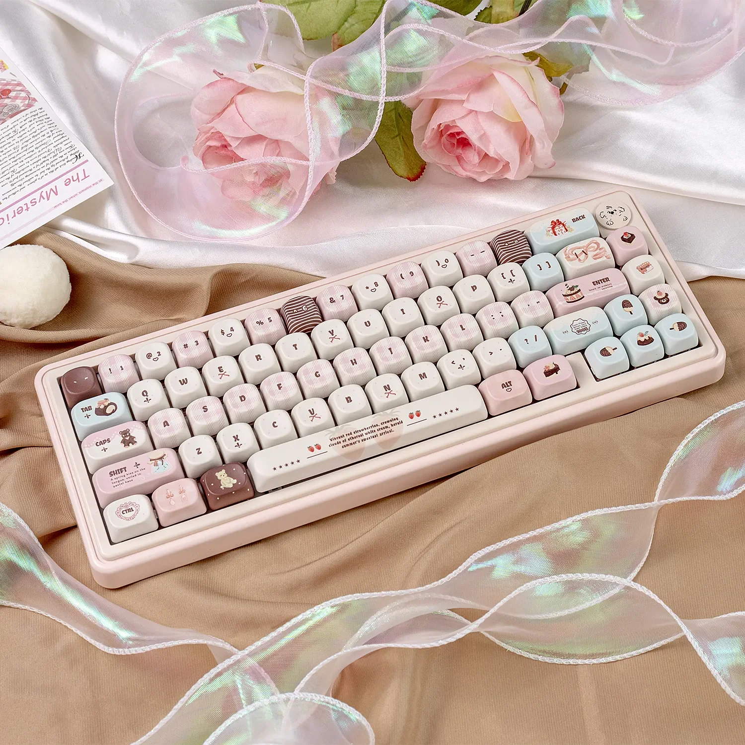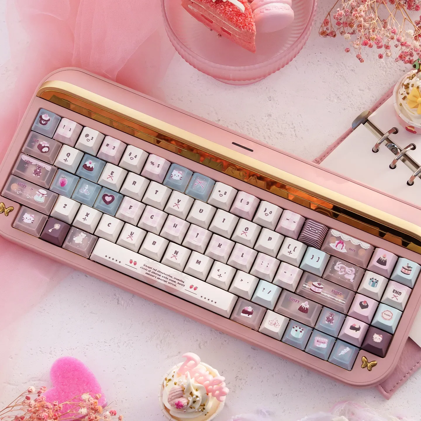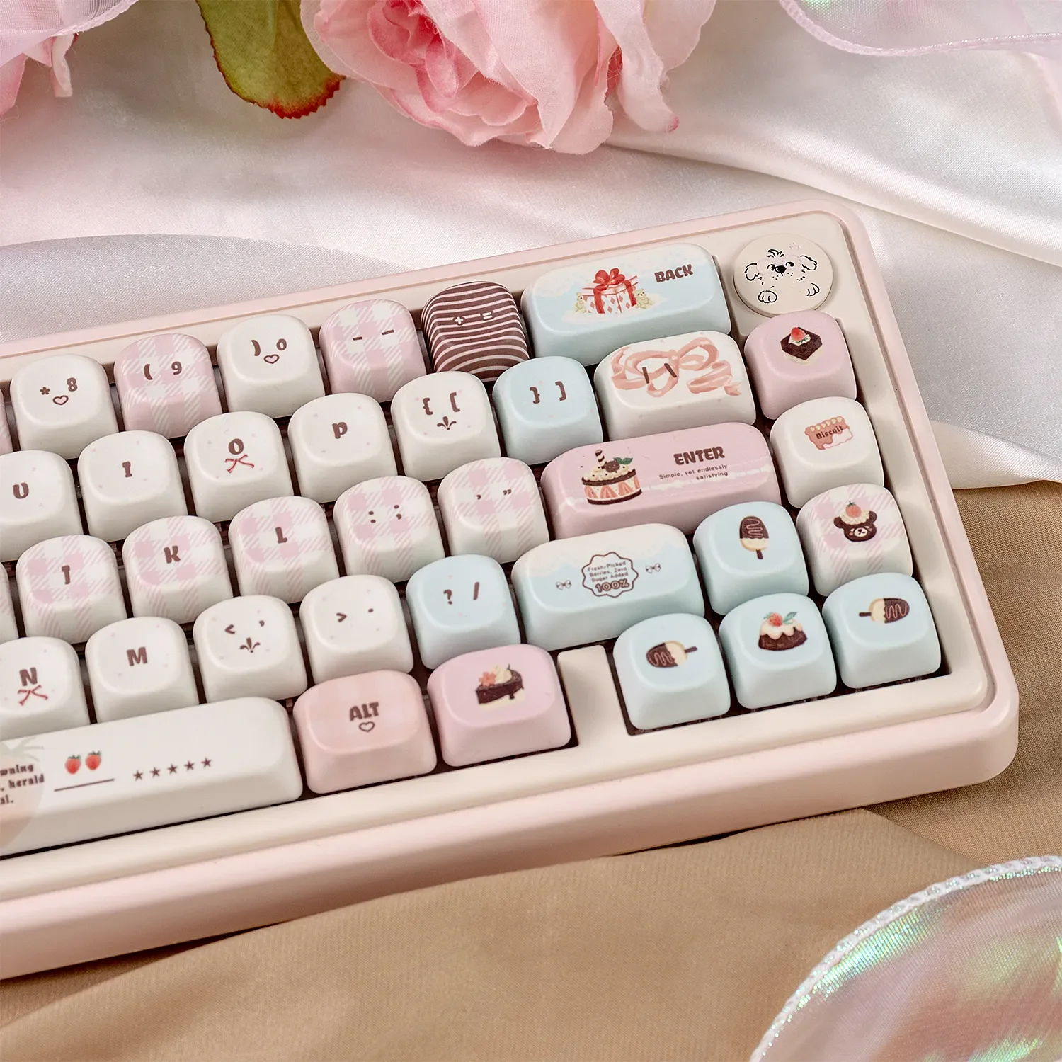Step into a world of cozy nostalgia with our captivating Velvet Strawberry Series Keycap Set. This artistic keycap set blends whimsical design with premium aesthetics, inviting a touch of delight to your creative workspace. Each of these custom PBT keycaps is meticulously crafted from a PBT+PC blend, offering a unique frosted translucent finish that glows with an ethereal charm. The tactile satisfaction of these custom PBT keycaps is matched only by their visual appeal, as the frosted translucent effect creates a soft, inviting glow. The durable dye-sub keycaps promise a lasting aesthetic, keeping the whimsical strawberry designs vibrant through countless typing sessions. Elevate your keyboard with these charming frosted keyboard caps, meticulously designed to fit seamlessly on most mechanical keyboards, including compatibility for MOA Profile Keycaps and Cherry height. Turn every keystroke into an experience of pure delight with this truly unique keycap set.
