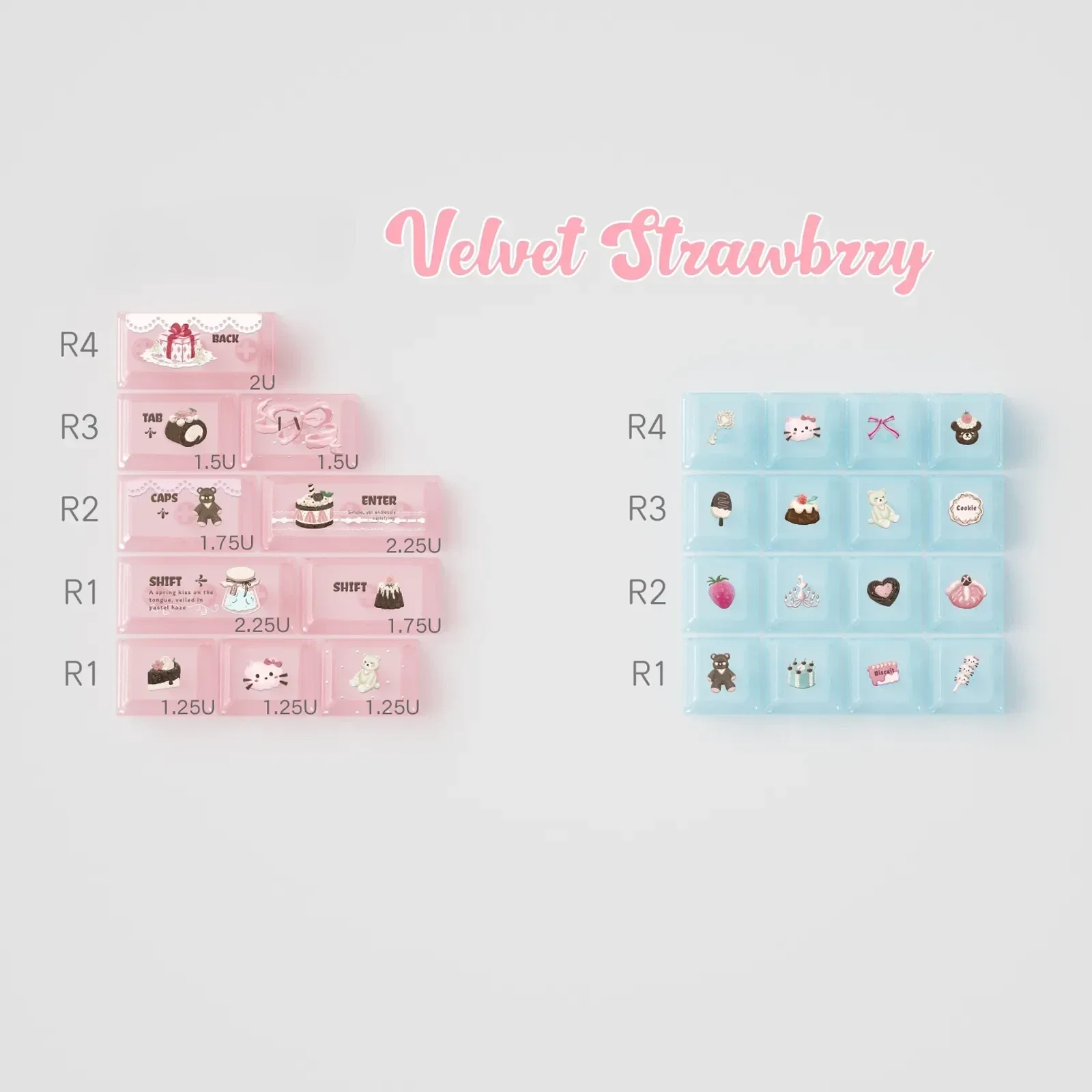 Velvet Frosted Strawberry PBT+PC translucent keycaps set collection: sweet frosted details and an ethereal glow for a whimsical, artistic keyboard.