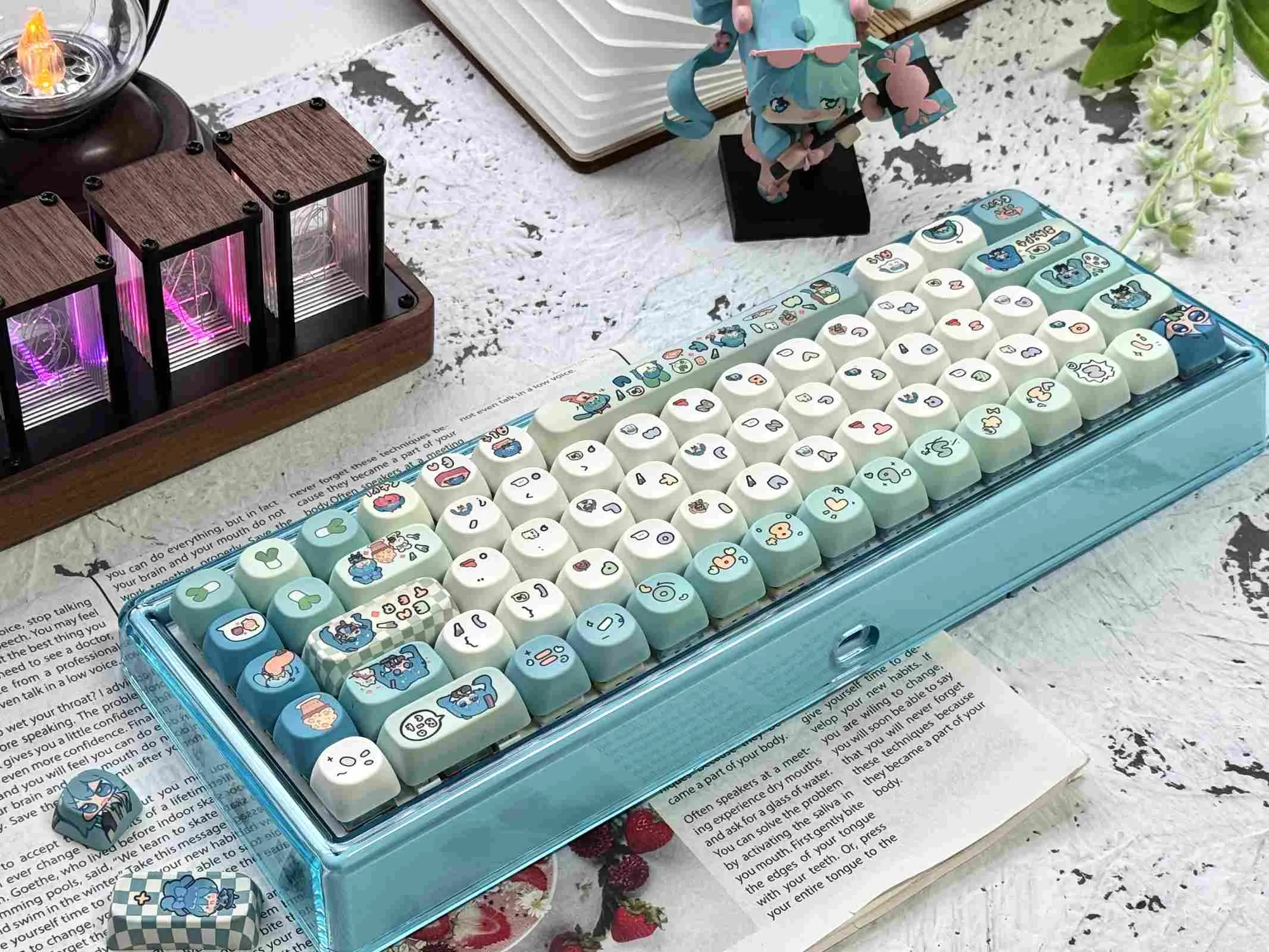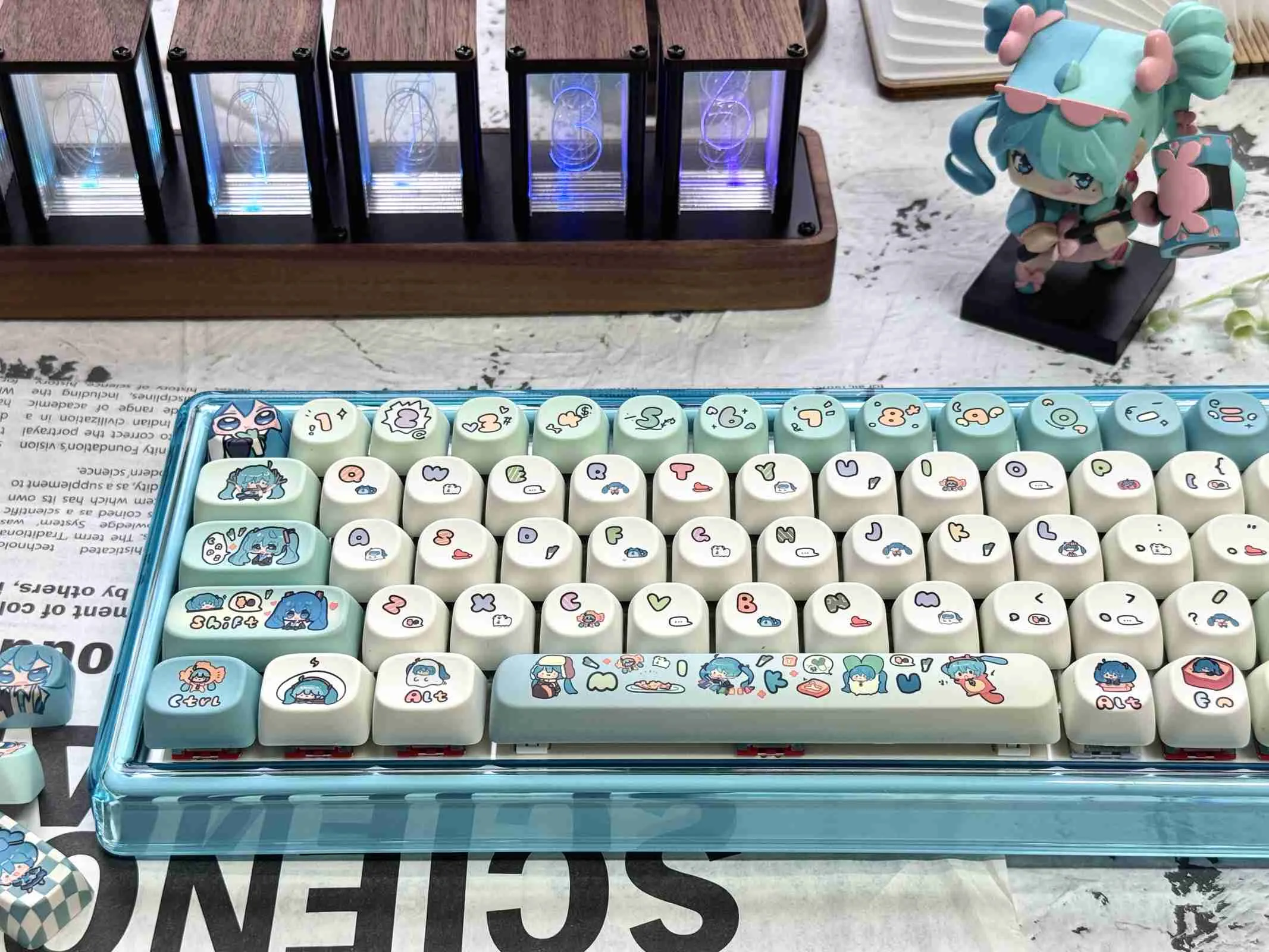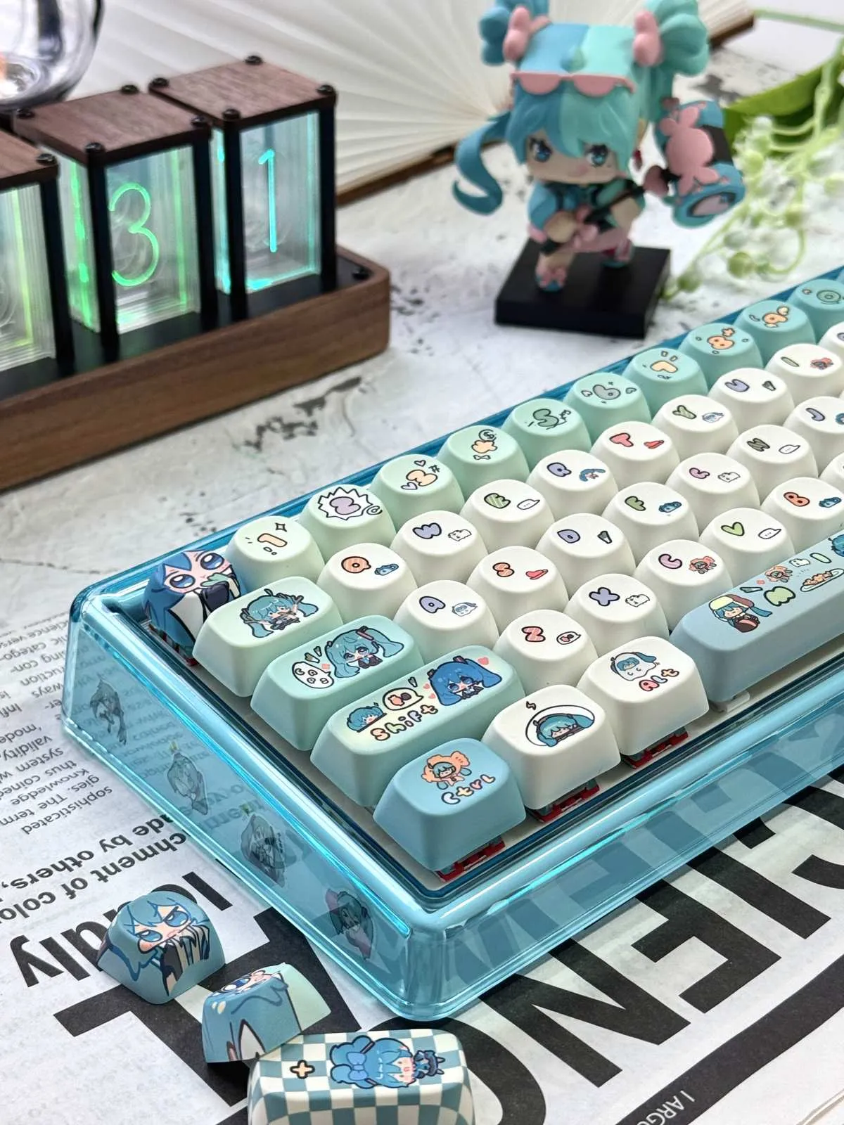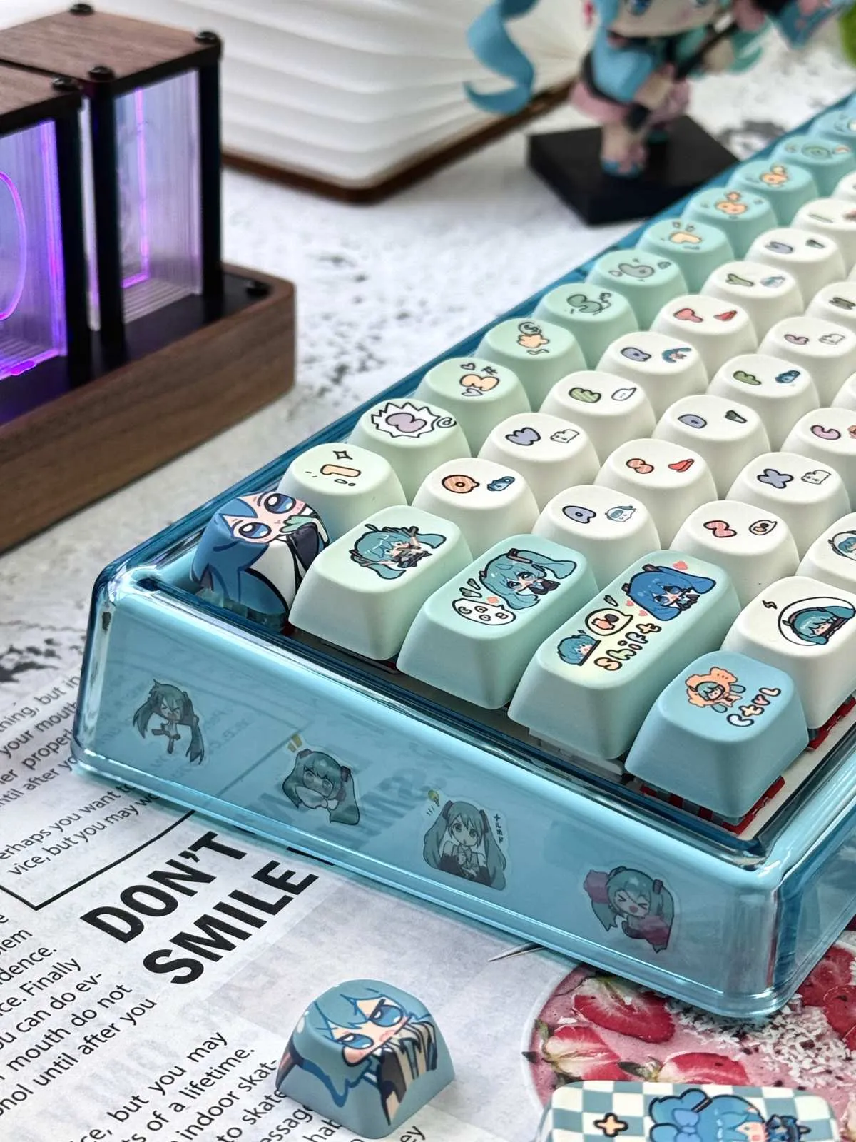 Improve your typing experience with the VOCALOID: Hatsune Miku Base68 Tri-Mode Mechanical Keyboard! Stellar, Belle or Ocean Heart switches are available for customized performance on this gorgeous keyboard. Tiffany blue keycaps look great with its sophisticated white base. That giving it a lively and modern appearance. The look is enhanced with colorful letters in a distinctive font style. Which making every keystroke enjoyable. Keycaps include adorable character icons such as those for the Tab and ESC keys. The character name “Miku” boldly displayed by the Space Key that adds a unique touch. This keyboard which is made of sturdy PBT. That is ideal for any fan of Hatsune Miku who wants to add some color to their workstation!